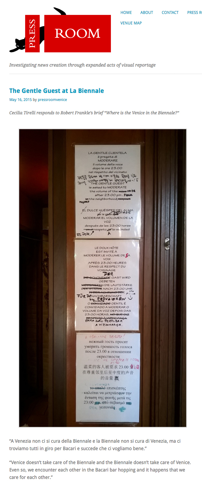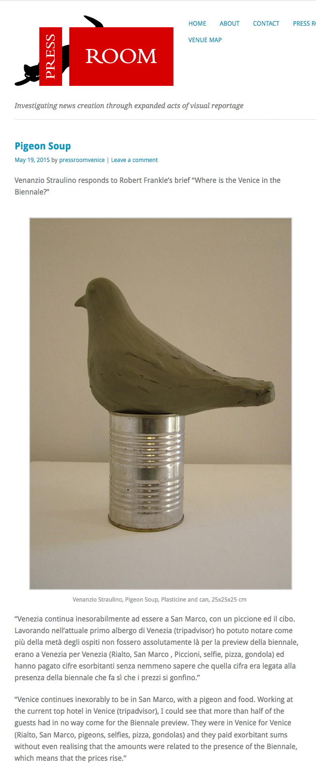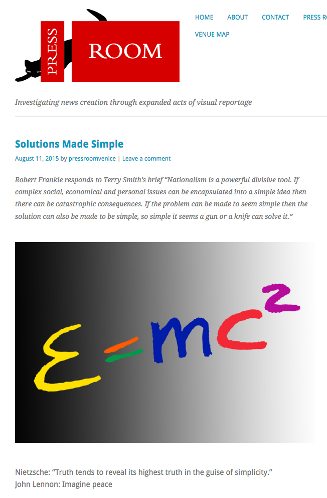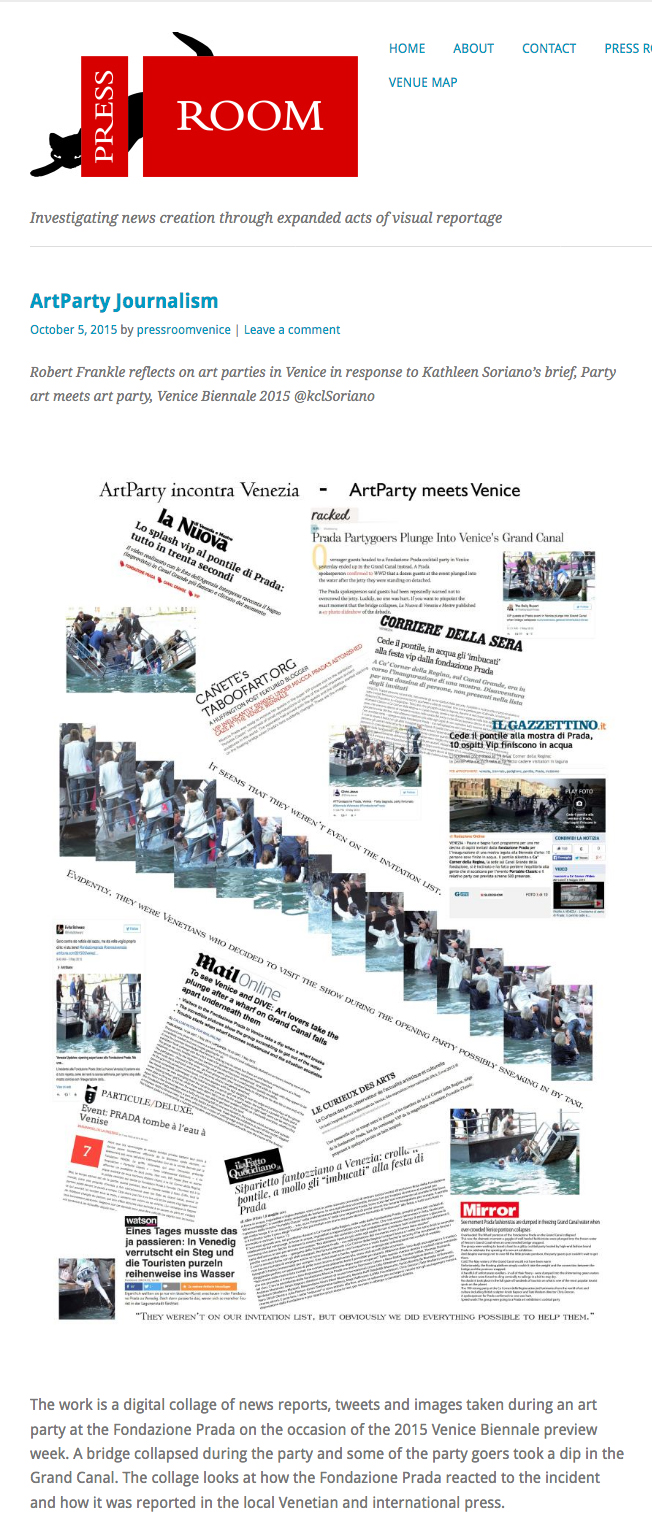 Press Room was a curatorial and artistic project conceived around the 2015 Venice Biennale in collaboration with several English artists. It was produced during the Biennale's preview week and then a second time as a participation in the Creative Time Summit held at the Arsenale during the summer. The project aimed to mirror the structures of the press via press conferences and a presence on social media, including Facebook and Twitter. Artistic responses were a substitute for journalistic press articles.